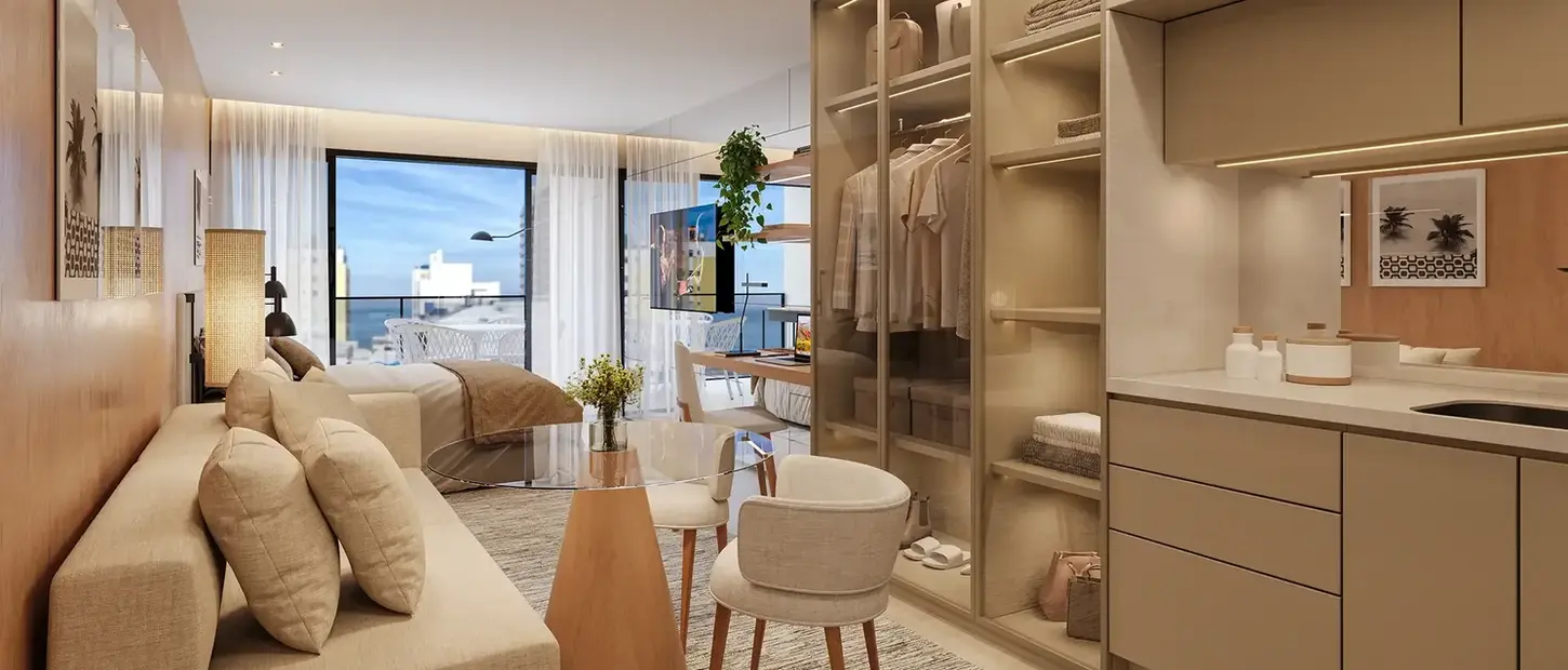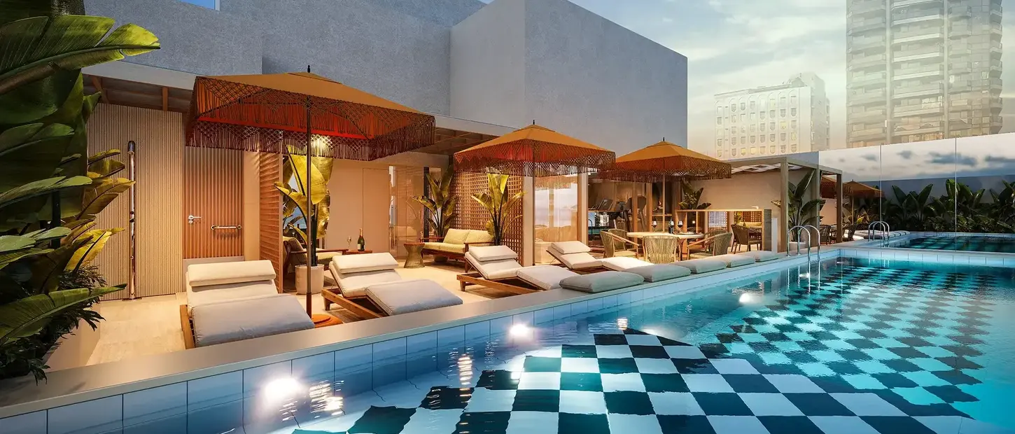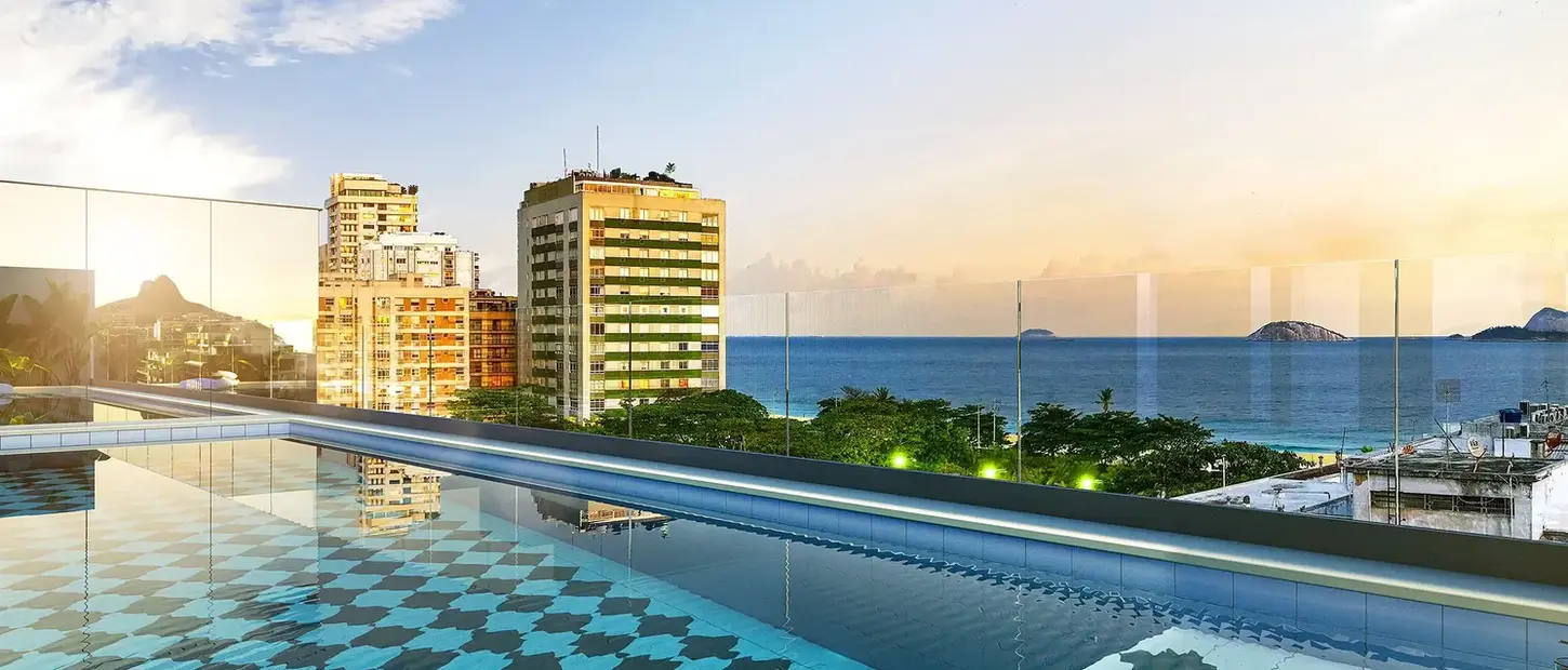 Esse projeto une o ritmo urbano de Ipanema ao privilégio de morar no bairro. No térreo, lojas abertas para a rua e apartamentos garden com jardins privativos. A torre traz oito andares de studios funcionais, alguns com varandas amplas e iluminadas. No 9º, surgem terraços abertos, e no topo, coberturas de um quarto com terraços privativos. A área de lazer na cobertura, com piscina, traduz o espírito leve e sofisticado de Ipanema.